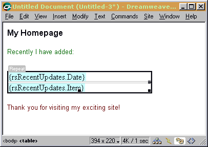 If you were to publish the page now (you can try if you like) you would see the first record of the set displayed. Great you may think - but really we want to show the last three updates to the site. For this, we need to use a new type of Behavior - a Server Behavior - and in particular, the Repeat Region SB.